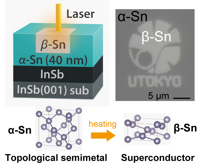 図1:レーザ照射によるトポロジカル半金属α-Sn薄膜中の任意形状の超伝導β-Snナノパターニング。InSb(001)基板上にエピタキシャル成長したα-Sn薄膜(厚さ40 nm)に集光したレーザを照射することで、照射領域のみを原子レベルで平坦な超伝導体β-Snへと相転移させ、任意形状のα-Sn/β-Sn平面ナノ構造を非破壊で作製した(左上)。右上は作製したパターンの例(ロゴを表す白い部分がレーザ照射により作製した超伝導β-Sn、灰色部分がトポロジカル半金属α-Sn、スケールバーは5 µm)。相転移後のβ-Snは臨界温度TC = 3.7 Kの超伝導を示す。量子デバイス応用に向け、超伝導/トポロジカル材料ヘテロ構造の高精度ナノ加工を簡便な手法で可能にする作製技術である。