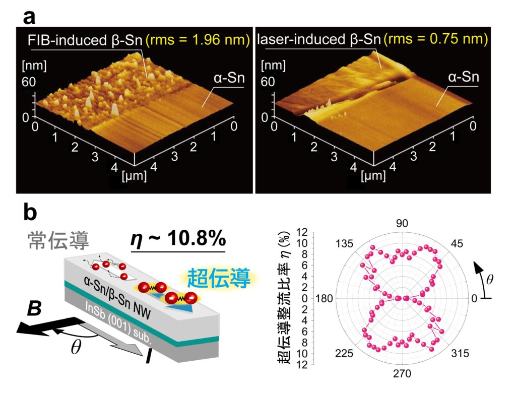 図2:レーザー誘起β-Snの原子レベル平坦化と、β-Snナノ細線における超伝導ダイオード効果。(a) α-Sn薄膜上に形成したβ-Sn領域の表面形状(AFM像)の比較。従来のFIB加工で作製したβ-Snは表面粗さが大きい(rms = 1.96 nm)のに対し、本研究の集光レーザ照射で誘起したβ-Snは、照射領域が原子レベルで平坦(rms = 0.75 nm)となり、α-Sn/β-Sn界面も滑らかに形成される。(b) α-Sn/β-Snナノ細線(NW)デバイスの模式図と、超伝導ダイオード効果における磁場の角度依存性。面内磁場Bの方向(角度θ)を変えると、電流の向きが順方向と逆方向で超伝導電流の流れやすさが非対称となり、その整流率ηは最大約10.8%に達する。右の極座標プロットは、整流率(超伝導整流比)のθ依存性を示し、磁場方向に応じて効果が強く現れることを示している。超伝導ダイオード効果は磁場をかけない場合(無磁場)でも観測される。